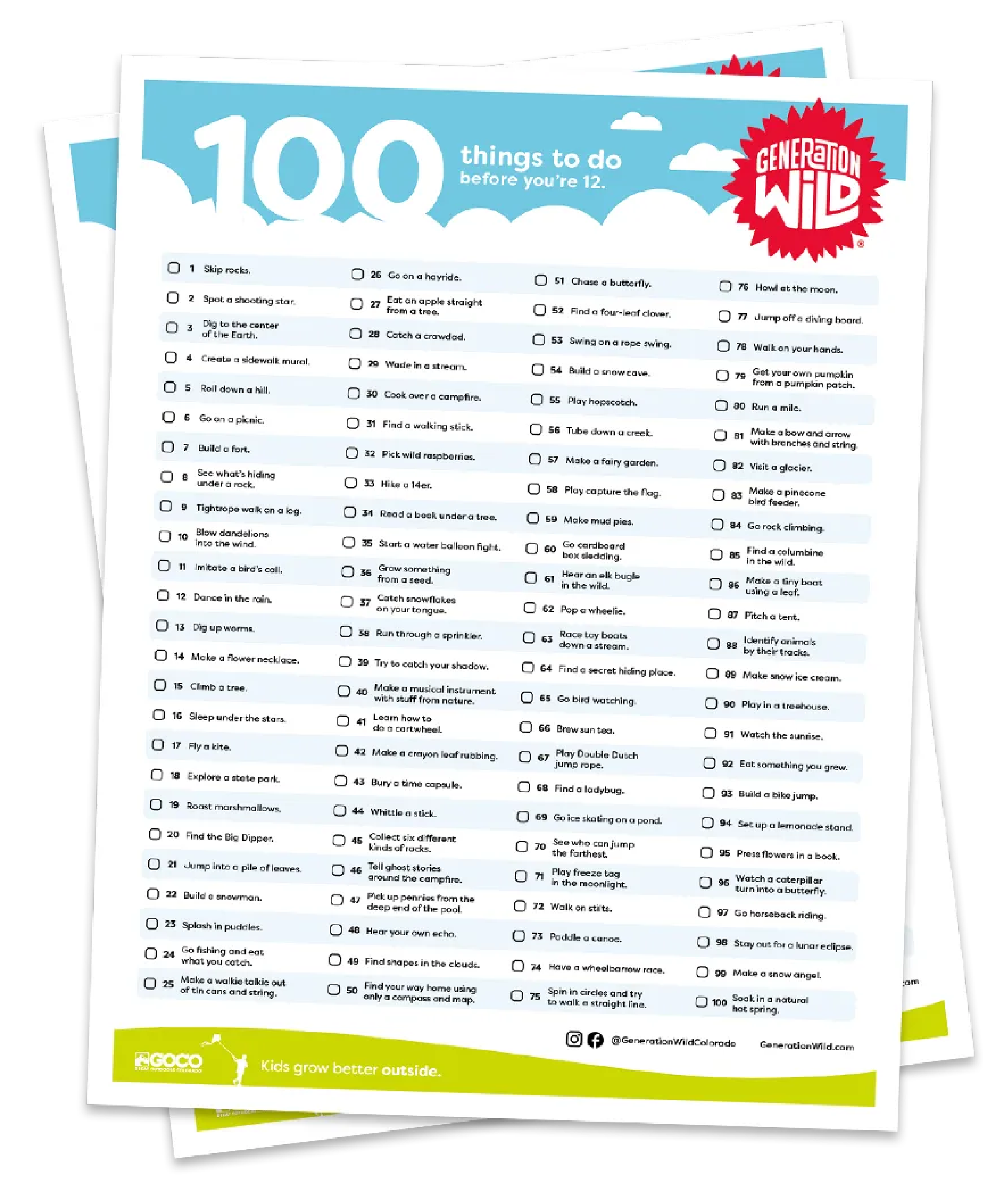 We get it, it’s hard to keep your kids entertained. That’s why we created a list of 100 Things to Do Before You’re 12. Click below to download The List so you and your kids can have fun crossing off outdoor activities all year round, from your backyard to the backcountry.